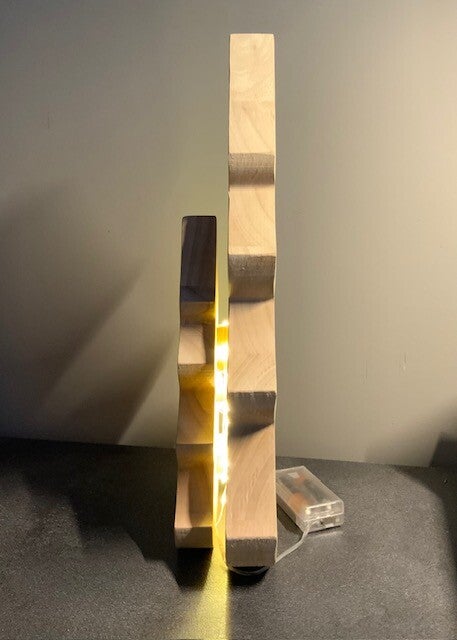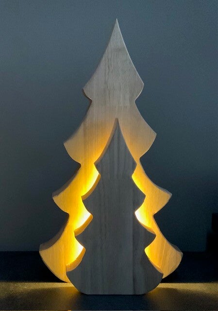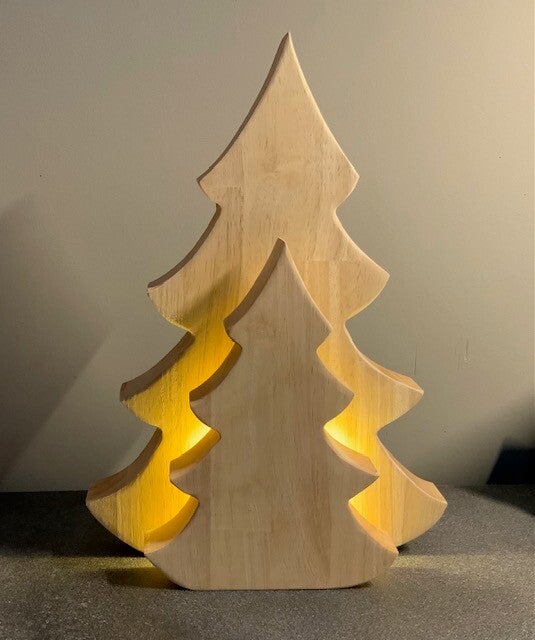 Dit product bestaat uit 2 kerstbomen in Rubberwood. Het is een kleine kerstboom, die vastgemaakt is aan een grotere kerstboom. Tussen de 2 bomen zit verlichting (de verlichting werkt op AA batterijen, deze zijn niet inbegrepen).